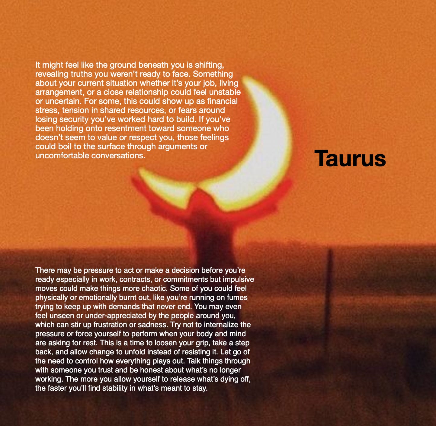 Taurus Full Moon HoroscopesLet it all burn down Destiny McGregorNov 04, 20251ShareThe astrology right now is - to put it lightly - quite unstable and unpredictable. Lets use these times to let go of the old and step into our most juicy authentic selves!Read for your Rising, Sun, & Moon.